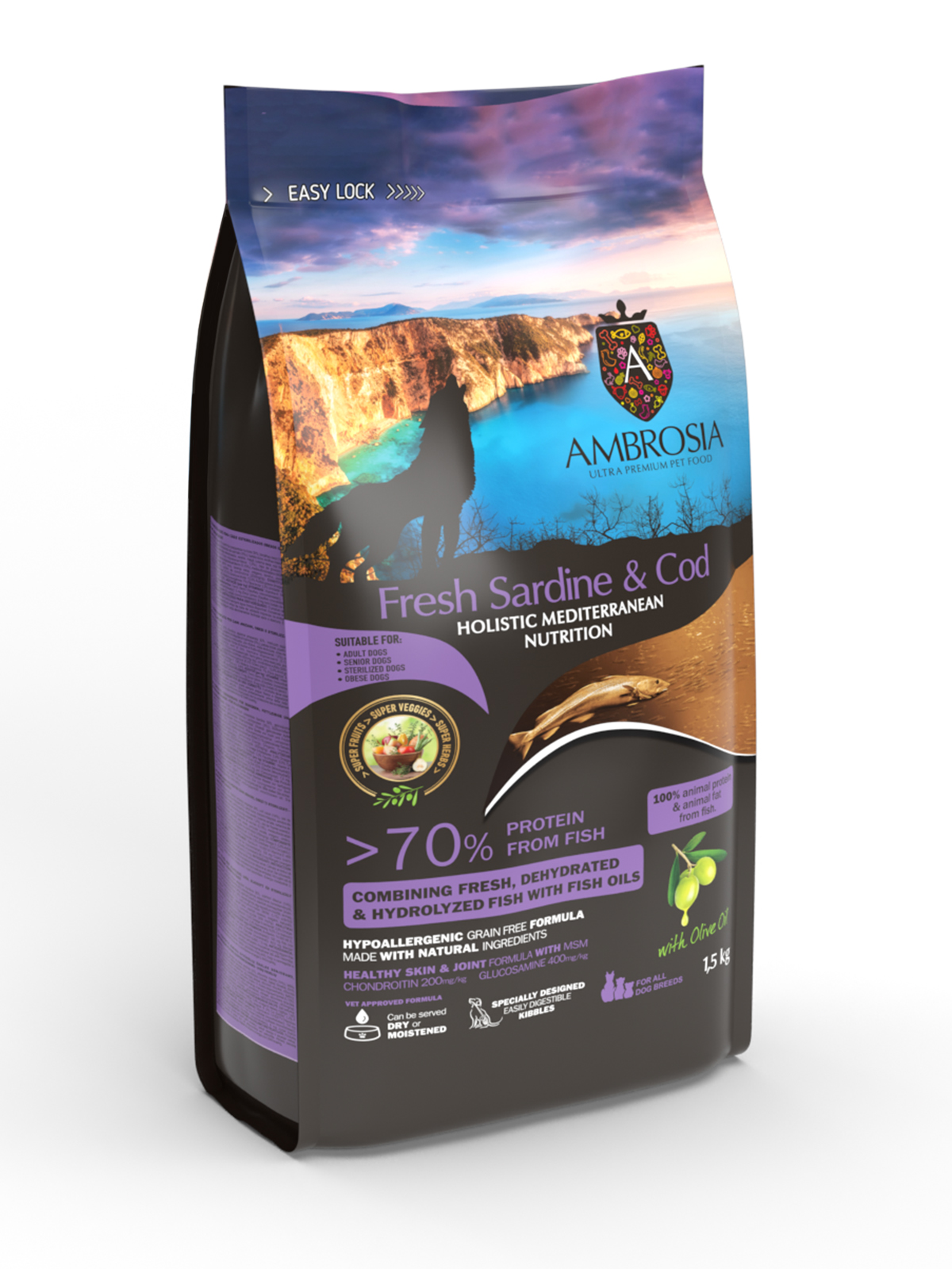 Con la giusta quantità di olio d'oliva e un mix di frutta ed erbe mediterranee, offriamo un cibo per cani ipoallergenico, in stile mediterraneo, senza cereali, ricco di antiossidanti adatto a tutte le razze canine. Il sapore e il gusto forniti dalla combinazione di ingredienti di qualità umana delizieranno sicuramente il tuo cane, offrendo al contempo una nutrizione olistica che assicura salute e longevità.