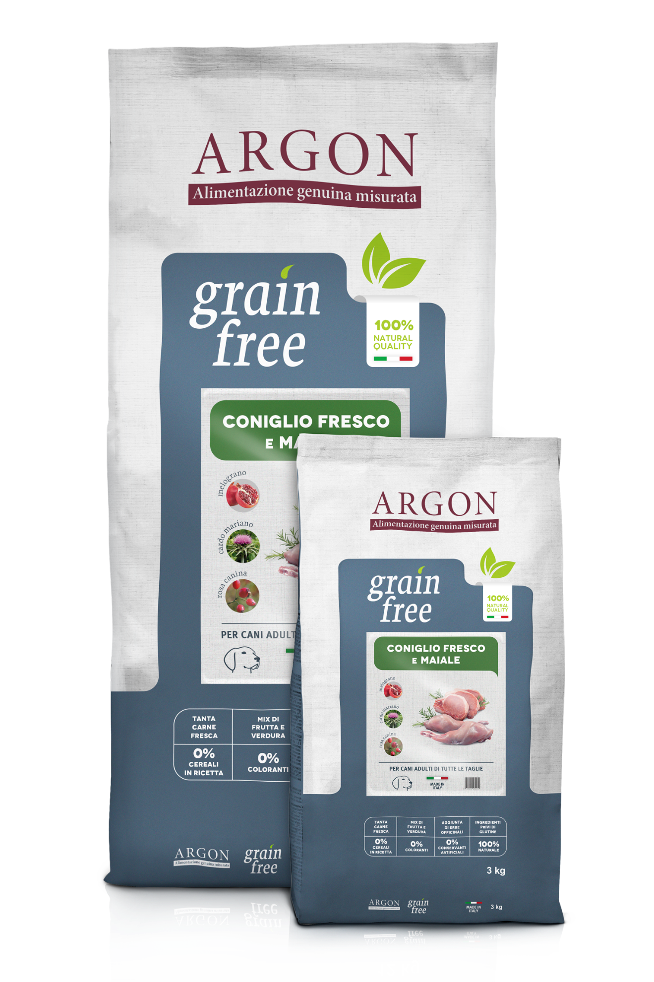 Argon Grain Free è una linea di mangimi Italiani per cani di altissima qualità, studiata per offrire al cane adulto una combinazione di nutrienti completamente bilanciata, ricca e completamente priva di cereali.