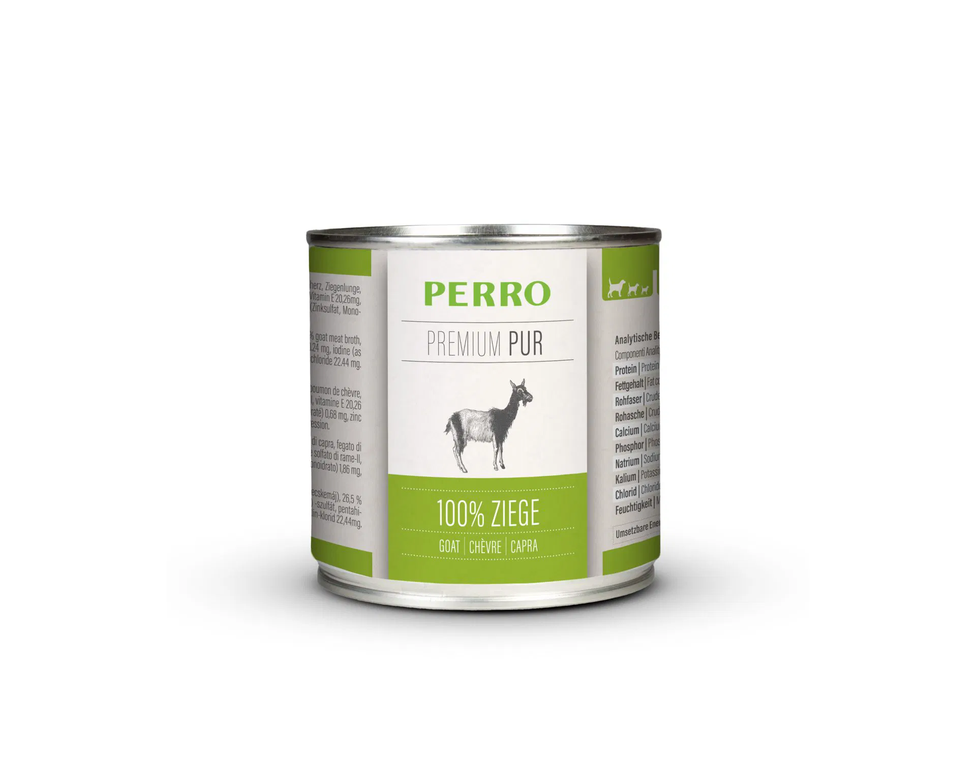 PERRO Premium Pure Goat è un alimento umido monoproteico naturale, facilmente digeribile e a basso contenuto di grassi, senza carboidrati ma con nutrienti preziosi, ideale per cani sensibili e amanti della buona cucina.