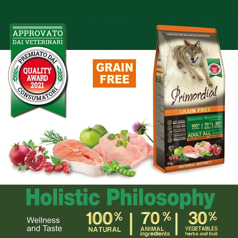 salmone fresco (35%)carne di pollo disidratata (24%), piselli, patate, grasso di pollo (11 %), fagioli, semi di lino (2%), polpa di barbabietola, lievito, alghe in polvere (0,3%), oligofruttosio (0,2%), prodotti di lievito (0,2%), Yucca schidigera (0 03%), cardo mariano (Silybum marianum L.) (0,02%), melograno disidratato (Punica granatum) (0,02%), mela disidratata (Malus pumila) (0,02%)rosa canina frutto disidratato( Rosa Canina LR, pendulina L.) (0.002), more disidratate (Rubus ulmifolius Schott) (0,0006%), glucosamina, condroitina solfato, estratto di rosmarino.