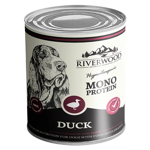Il cibo umido Riverwood mono-proteico all'anatra contiene esclusivamente proteine d'anatra. Grazie a questa unica fonte proteica, è particolarmente indicato per cani con intolleranze o allergie alimentari e può essere utilizzato anche in una dieta a eliminazione.