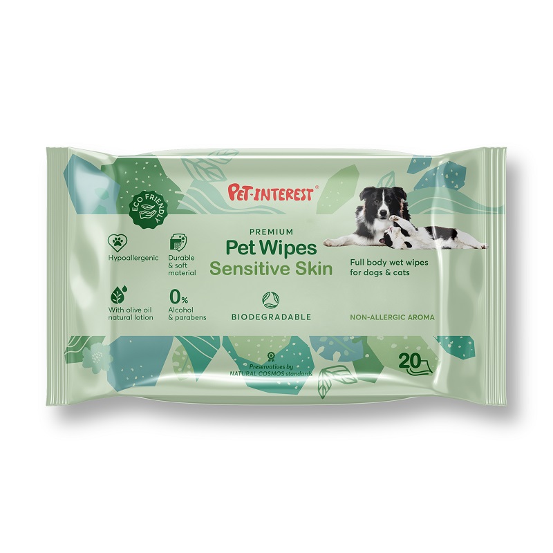 Salviette umidificate biodegradabili per animali domestici con superficie goffrata. Ipoallergeniche - con lozione all'olio d'oliva, aloe vera, camomilla e albero del tè.