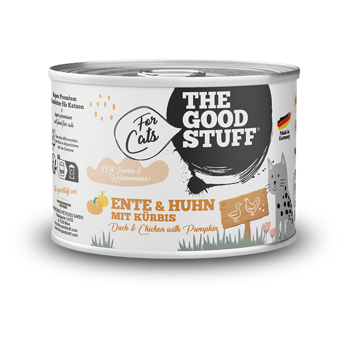 ANATRA e POLLO con ZUCCA è un alimento umido senza cereali di comprovata qualità super premium di THE GOODSTUFF For Cats. L'elevata accettanza di THE GOODSTUFF For Cats è il risultato dell'utilizzo di materie prime di altissima qualità: la gustosa carne di anatra e la carne di pollo a basso contenuto di grassi sono altamente digeribili e ricche di preziose vitamine e nutrienti. Il nostro alimento umido per gatti è cotto delicatamente, contiene il 40% di carne fresca di muscolo di pollo e frattaglie di alta qualità provenienti da fornitori regionali, il 26% di carne fresca di anatra e raffinato con verdure, taurina ed erba gatta disponibili localmente.